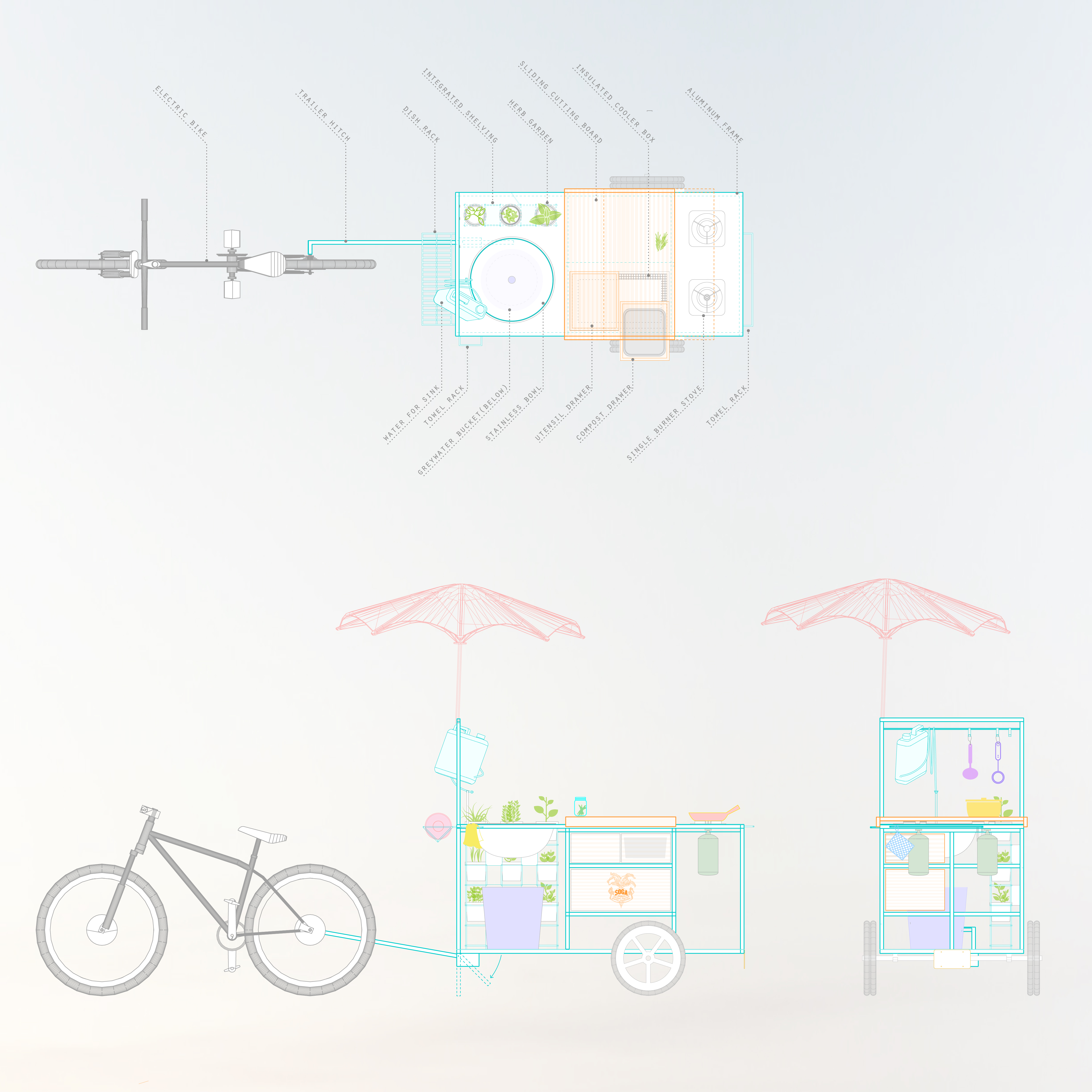 The food justice bike trailers were built through the embARC Summer Design Academy at University of California, Berkeley’s College of Environmental Design. Focusing on issues of food security, students collectively built two produce cargo trailers, a farmstand trailer (The Tour de Fruit), and a kitchen island trailer (The Kitchlet) in partnership with the Basic Needs Center, Berkeley Food Institute, and University Health Services. The intention was to promote food justice through improving resource distribution among campus farms and gardens, increasing visibility and accessibility of the food pantry and empowering people with the knowledge of how to cook and eat healthful food.