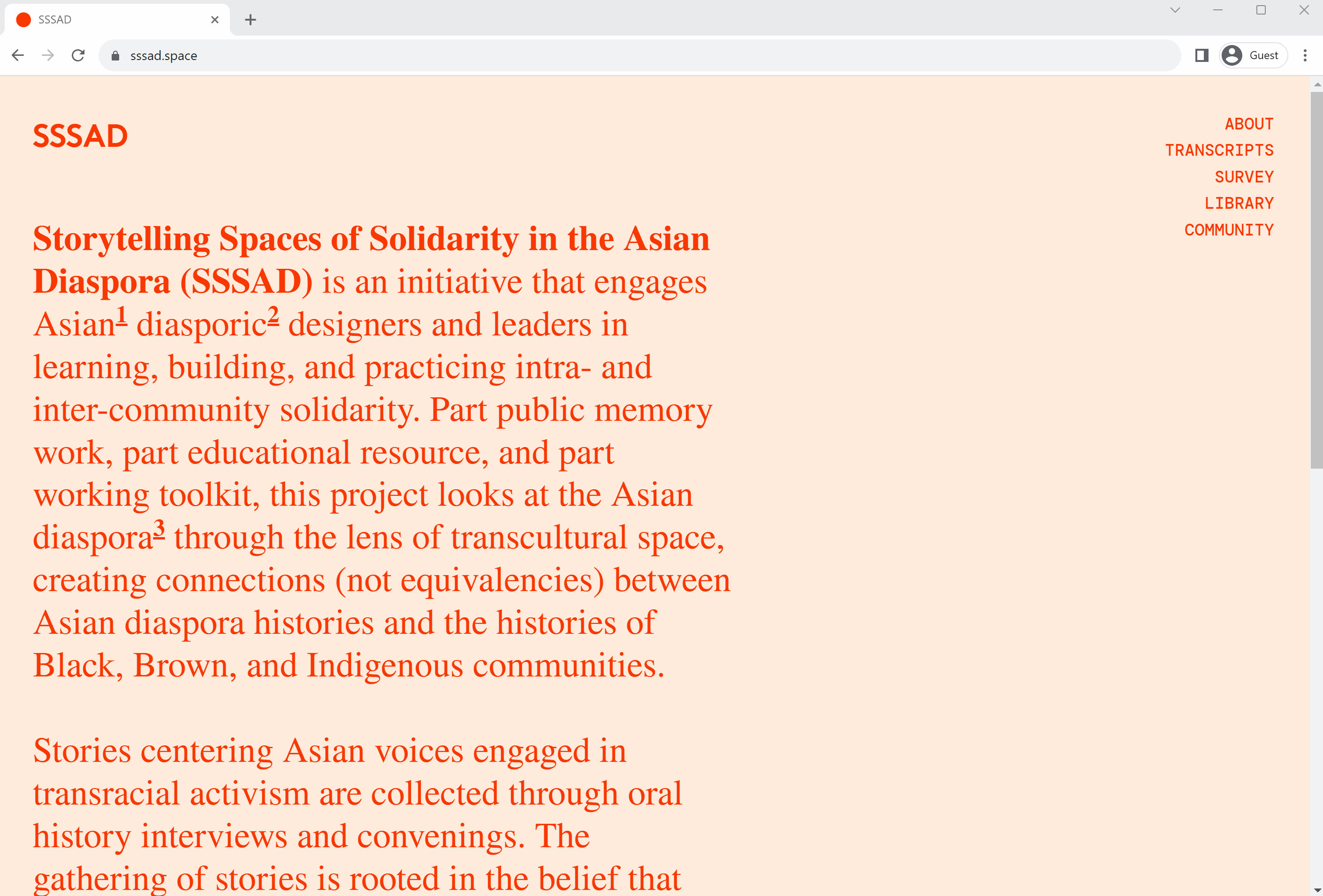 This initiative engages Asian diasporic designers and leaders in learning, building, and practicing intra- and inter-community solidarity. Part public memory work, part educational resource, and part working toolkit, this project looks at the Asian diaspora through the lens of transcultural space, creating connections (not equivalencies) between Asian diaspora histories and the histories of Black, Brown, and Indigenous communities. Stories centering Asian voices engaged in transracial activism are collected through oral history interviews and convenings. The gathering of stories is rooted in the belief that shared knowledge is a form of mutual aid. While it is important to amplify Asian voices, which are historically erased from our national consciousness, this project foregrounds Asian experience as inherently bound to other BIPOC communities. The freedoms that some of us have been afforded are predicated on the oppression of others. This unsettling reality structures Asian solidarity as a process of undoing and uplifting.